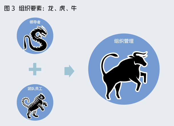 在组织要素的三个构成要点中,领导者和团队员工是构成组织的人,组织管理是人组织起来的方式。图3给我们的启示是,组织中的领导者可能是具有很强能力的“龙”,组织中的员工也可能是具有很强个人能力的“虎”,但要想实现组织的有效管理,还需要通过组织的规章、制度、企业文化,把组织变成能够实现稳定产出和持续增长的“牛”。