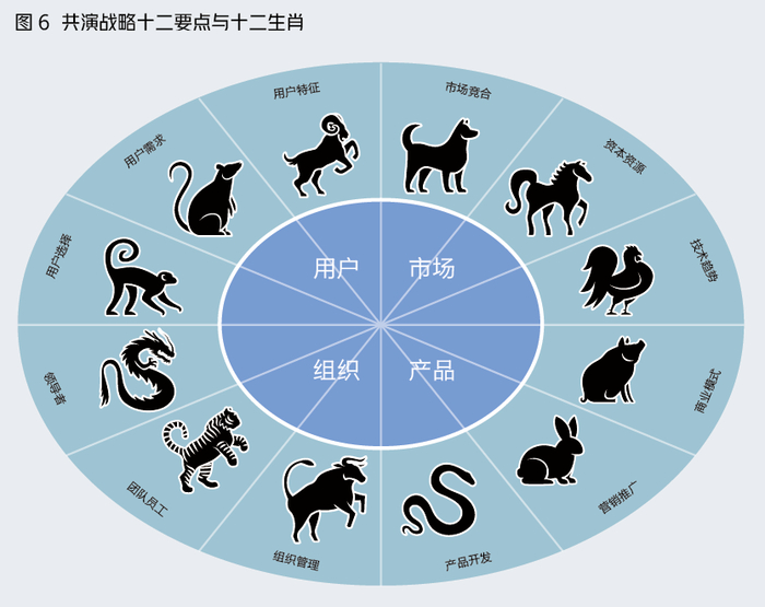 用十二生肖比喻共演战略的十二要点,不仅能够把战略管理的核心要点形象地展示在管理者眼前,启发管理者进行系统的战略思考(图6),而且能够从企业生命周期的角度出发,把战略管理的核心要点放在企业生命全周期中进行讨论,促进管理者形成动态战略思维。
