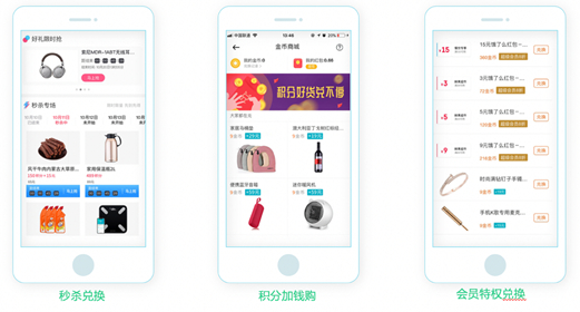 1、积分兑换模块——突出积分价值/丰富的兑换玩法/优质卡券支持/商品一站式采购支持