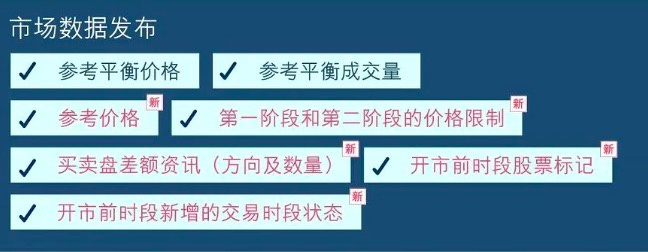 在披露参考平衡价格、参考平衡成交量的基础上,新增披露参考价格、第一阶段和第二阶段的价格限制、买卖盘差额资讯(方向及数量)、开市前时段股票标记、开市前时段新增的交易时段状态。