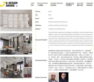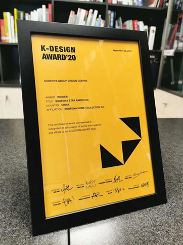 从2020年6月参赛到7月获奖,再到10月拿到获奖证书,历经近4个月的时间,索菲亚星隔断产品从全球21个国家2199件作品中脱颖而出,成为K-DESIGN(韩国设计奖)2020年度大赛中全球10%的获奖者之一。索菲亚一直坚持着“设计引领全球”的设计宗旨,索菲亚的产品设计也正慢慢被国际上越来越多有含金量、有权威性的国际设计奖项所看见,收获了诸多国际上的认可。