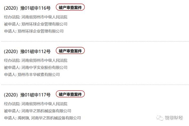 查阅正式公告,发现两家企业都在10月13日被郑州市中级人民法院立的案,申请人分别是巩义市邢村煤矿和郑州市丰华碳素有限公司,目前都处于“破产审查”阶段。