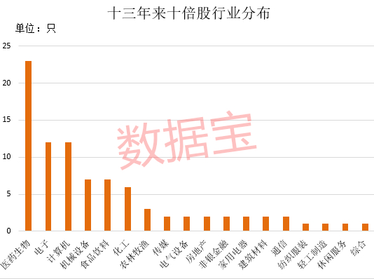 证券时报·数据宝统计显示,十三年来,共计诞生了88只十倍股(注:包含后面上市的股票,区间涨幅不含上市首日)。分行业看,这些股票主要集中在医药生物、电子、计算机三大科技行业,合计占比53.41%。医药生物行业入围股数量最多,有23只。