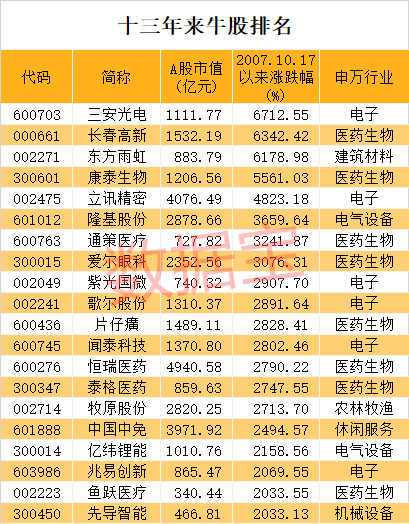 十三年前的2007年10月16日,沪指达到历史巅峰6124.04点。十三年后的今天,沪指定格在3336.36点,与历史高点相比仍有45.52%的差距。在这十三年时间里,A股发生了翻天覆地的变化,创业板开市、沪深港通启动、科创板开市、A股纳入MSCI、创业板注册制落地等。那在十三年时间里,A股诞生了哪些大牛股?