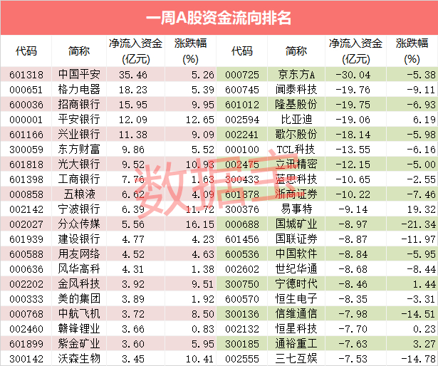 单只股票来看,净流入规模前五位的依次是中国平安、格力电器、招商银行、平安银行、兴业银行,中国平安净流入规模35.46亿元居首。主力资金净流出规模前五位的依次是京东方A、闻泰科技、隆基股份、比亚迪、歌尔股份。京东方A净流出金额30亿元排在首位,本周累计下跌5.38%。