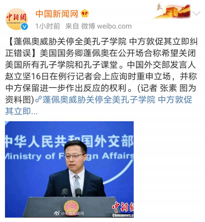 今日午后,据中新网报道,美国国务卿蓬佩奥在公开场合称希望关闭美国所有孔子学院和孔子课堂。中国外交部发言人赵立坚在16日例行记者会上应询时重申立场,并称中方保留进一步作出反应的权利。