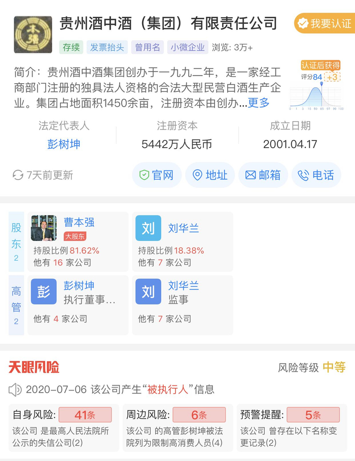 2020年7月,遵义市中级人民法院发布执行裁定书,酒中酒及其所属企业茅台镇古镇酒业有限公司因合同纠纷,被裁定冻结、划拨存款2600万元;2020年7月,酒中酒还与中国民生银行成都分行产生了金融借款合同纠纷;2020年3月,贵阳市中级人民法院对酒中酒及单位相关负责人彭树坤发布了限制消费令。