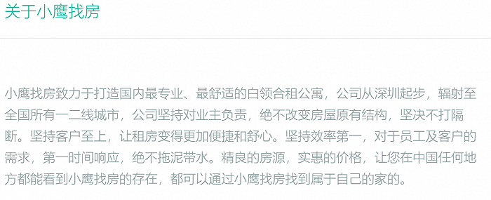 和大部分公司的自我介绍也不同,小鹰找房在对自己的说明里,表达比较含蓄。没有任何量化的数字,反而更多极端词汇如“最舒适、绝不、坚决不……”,最后一句还出现了疑似病句,也是非常“另辟蹊径”。如上图。