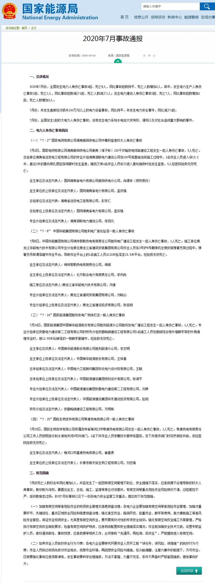 国家能源局网站10月16日发布《2020年7月事故通报》,全文如下: