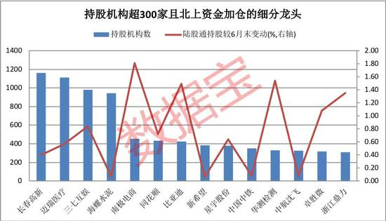 需要补充的是,入选龙头股中半数以上自7月以来至今获陆股通加仓,如国际上少数具备力矩传感器自主生产的电机龙头八方股份最新陆股通持股较6月末增加25个百分点以上,化学原料龙头国瓷材料获加仓4.15个百分点,大族激光、中际旭创等股加仓均超过2个百分点。另外,获北上资金加仓且持股机构超300家的股票有14只,包括比亚迪、南极电商等。