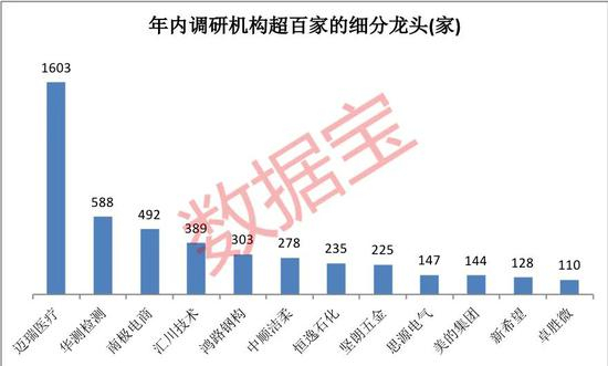机构的密集调研,意味着对公司高度关注且被看好。梳理发现,入选细分龙头股中有32股年内获机构调研,调研机构超过100家的股票共计12只,其中迈瑞医疗被“踏破门槛”,年内获1603家机构调研,也就是平均每天都有5家以上机构调研该公司。