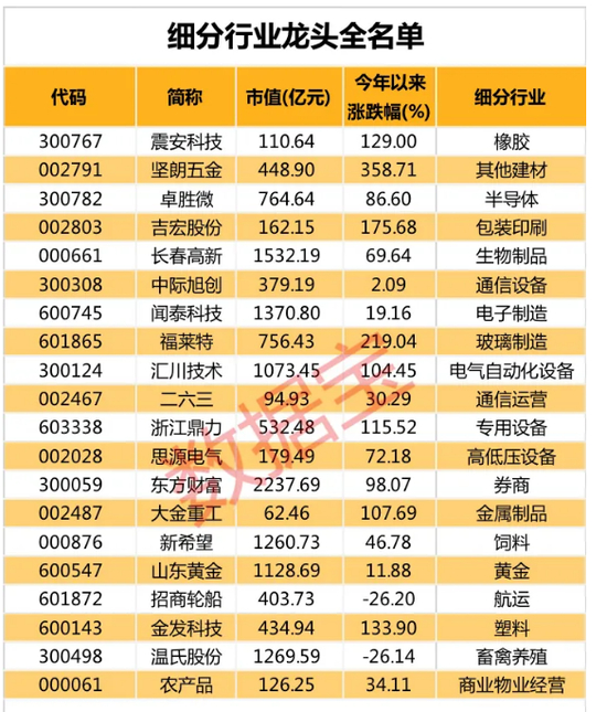 91股入选A股细分行业龙头 13股业绩有望持续高增长(名单)