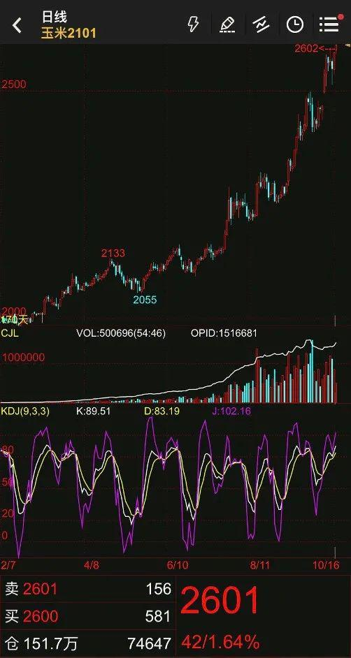 文华财经数据显示,玉米期货主力2101合约10月16日最高上摸至2602元/吨,创下2004年9月该合约上市以来新高,最新收报2601元/吨,今年以来累计涨幅更是达43.23%。仅就“十一”以来而言,该合约累计涨幅已达5.39%。