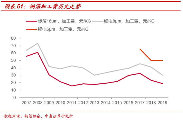 5、锂电铜箔:深蹲起跳,加工费上涨或将重演。21年锂电铜箔将逐渐结束供给过剩的局面,虽然锂电铜箔产能仍按部就班投建释放,但是由于需求的快速增长,最终使得锂电铜箔转归供应不足。我们预计1)加工费也将21年走入上升通道,当然2020年呈现出来的也可能是进一步的格局重塑——进入海内外锂电池巨头产业链是企业未来发展的核心,也是必然选择;2)为了能量密度提升,6μm锂电铜箔渗透率将持续提升,或将从2019年50%逐渐增加至80%以上,结构性差异也愈发明显,同时4.5μm也将逐步得到应用。