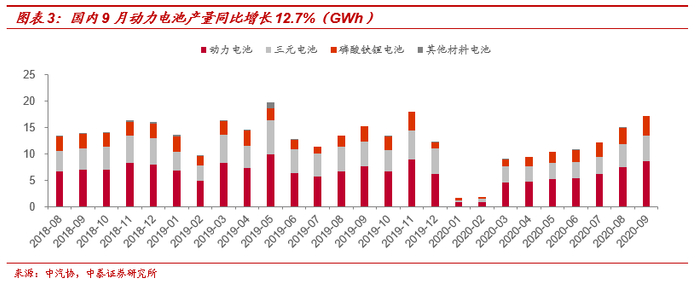 国内2020年1-9月动力电池产量累计43.6GWh,YOY-31%。但同样地,在2月见底后,动力电池产量逐渐回升,国内9月动力电池产量为8.6GWh,同比增长12.7%,其中三元电池产量4.4GWh,占总产量58.7%,同比下降4.3%,环比增长33.4%;磷酸铁锂电池产量3GWh,占总产量40.4%,同比增长45.4%,环比增长8.5%。