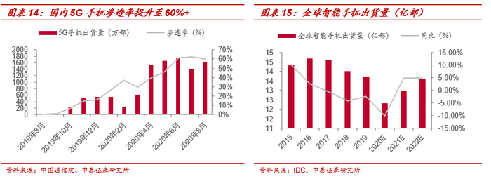 国内5G手机渗透率提升速度超市场预期。随着5G建设加速、应用加速推广以及消费高预期,再叠加5G手机可向下兼容4G、3G制式,未来5G增长将对非5G手机的替代,而这将是推动全球智能手机产业发展的主要动力。中国信通院手机市场运行分析报告显示,2020年8月,国内智能手机出货量为2690.7万部,环比增加20.6%,5G手机出货量为1617万部,占同期手机出货量的60.10%。