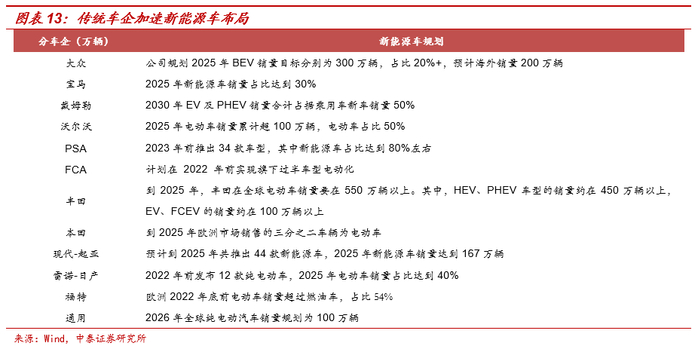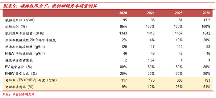 欧洲碳排放目标进一步趋严:根据《2030气候目标计划》,2030年乘用车碳排放需较2021年下降约50%,则对应2030年碳排放目标下降至47.5g/km(此前为59g),碳排放目标进一步趋严。欧洲电动车渗透率仍处于低位,发展空间广阔,其中挪威9月电动车渗透率为81.6%,瑞典新能源车渗透率为34%,德国渗透率为15.6%,法国电动车渗透率为10.6%,英国渗透率为10.5%,西班牙渗透率为5.7%,意大利渗透率为4.4%。在碳排目标、销量结构假设下,2030年欧洲电动车年均销量在700万辆+,渗透率50%左右。