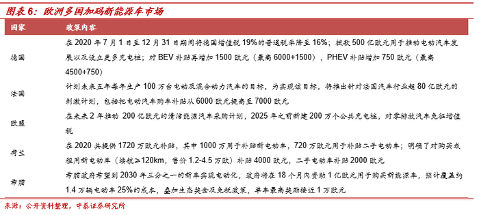 欧洲多国新能源补贴政策不断加码:1)德国:6月3日德国政府审核通过总额高达1300亿欧元的经济刺激方案,内容包括在2020年7月1日至12月31日期间将德国增值税19%的普通税率降至16%;拨款500亿欧元用于推动电动汽车发展以及设立更多充电桩;对BEV补贴再增加1500欧元(最高6000+1500),PHEV补贴增加750欧元(最高4500+750);2)法国:计划未来五年每年生产100万台电动及混合动力汽车的目标,为实现该目标,将推出针对法国汽车行业超80亿欧元的刺激计划,包括把电动汽车购车补贴从6000欧元提高至7000欧元,扩大有资格领取“旧车换现金”补贴的家庭数量等。全球新能源车市场或将迎来政策加码期,欧盟正致力于“经济绿色复苏方案”,在多国新能源汽车刺激政策之下,欧洲新能源车市场或强劲复苏。