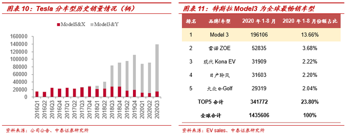 特斯拉Model 3显著放量,市场认可度凸显,是全球最为畅销车型。2018年5月后,随着电池产线问题得到解决,周产量得到迅速提升,2018年 6月底达到5000辆,因此进入到2018Q3,特斯拉Model 3销量得到显著提升,单季度销量达到约5.3万辆。从各品牌车型销量来看,Model 3销量远超其他品牌电动车型,2020年1-8月,特斯拉Model3销量19.61万辆,市场份额为13.66%,排名第二的车型雷诺ZOE销量仅为5.28万辆。