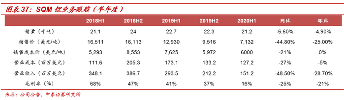 3)Orocrobre:由于COVID-19限制,Olaroz锂工厂在3月底关闭后,于4月9日重新开始生产,但开工率有所降低并根据需求弹性生产,2020Q2公司锂产量2511吨,同比下滑27%,环比下滑8%;锂销量为1601吨,同比下滑53%,环比下滑36%;上半年产量合计5243吨,同比下滑19.7%;