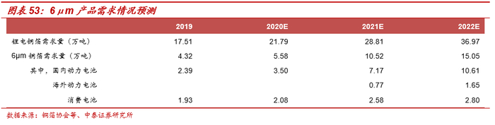更进一步,结构性差异也将更加明显,6μm高端锂电铜箔产品渗透率持续提升。我们预计高端铜箔渗透率将进一步提升,尤其是国内锂电池市场,渗透率或将从2019年的50%逐渐增加至80%以上,而海外锂电池市场目前仍以采用8-9微米铜箔为主。整体来看,6微米锂电铜箔需求量将从2019年的4万吨升至2022年15万吨,年均复合增长50%以上。