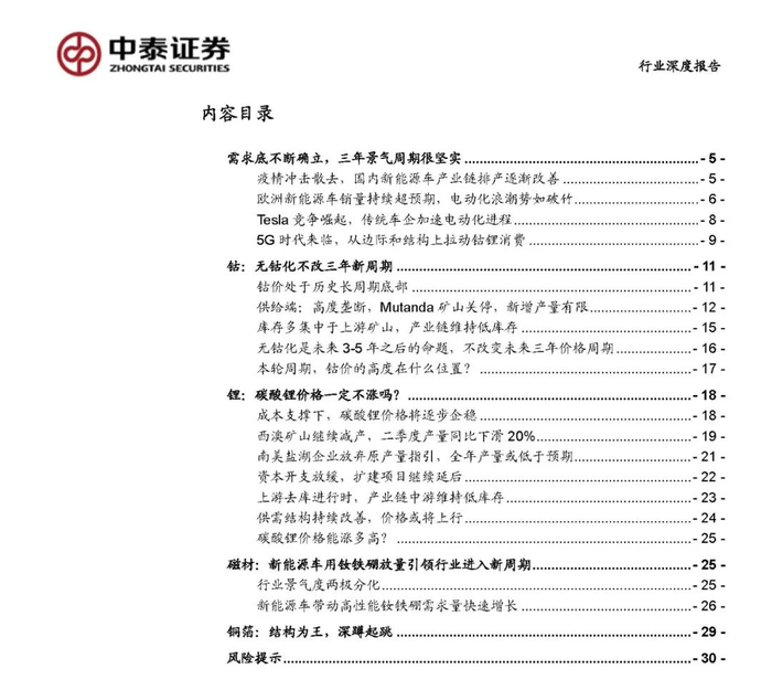 7、风险提示:锂钴产能超预期释放、新能源汽车销量低于预期、疫情二期爆发、产业政策波动等风险。