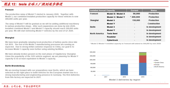 特斯拉加速全球化进程,产能逐步释放。上海工厂已于2020年1月7日正式交付第一辆国产Model3,并且已具备产量超3000辆/周生产力,年产能15万辆,ModelY预计21年开始量,电池PACK产能将快速提升。德国柏林Gigafactory4也正式落地,首批交付预计在2021年开始。特斯拉CEO马斯克表示,计划在2030年前特斯拉将每年生产2000万辆电动车。