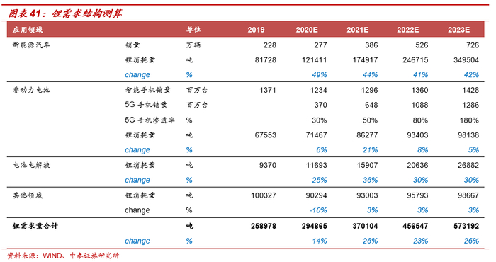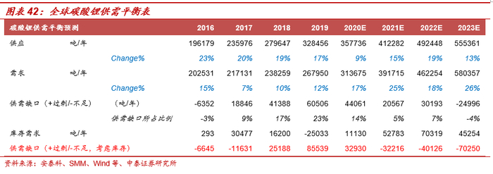 需求端维持高速增长,供需结构持续改善。假设2020-2023年全球新能源车销量分别为277/386/526/726万辆,则对锂的需求量分别为12.14/17.49/24.67/34.95万吨,同比分别增长49%/44%/41%/42%;全球智能手机的销量分别为12.34/12.96/13.60/14.28万台,则3C领域对锂的需求量分别为7.15/8.63/9.34/9.81万吨;其他领域对锂的需求量2020年同比下滑10%,此后保持每年3%的增长;据此测算,2020-2023年碳酸锂需求量分别可以达到29.49/37.01/45.65/57.32万吨,同比分别增长14%/26%/23%/26%。若考虑到补库的需求,2021年将出现供不应求的局面,锂价或将出现趋势性上涨。