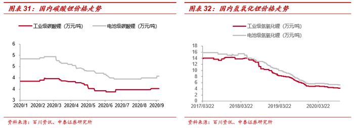 锂价继续探底,跌至成本曲线60%分位线以内。2020年上半年,受疫情影响,新能源车等终端需求表现不佳,锂价继续探底,锂辉石均价为463.96美元/吨,同比下滑31%;电池级碳酸锂均价为4.65万元/吨,同比下滑40%;国内电池级氢氧化锂均价为5.71万元/吨,同比下滑43%;韩国电池级氢氧化锂均价为7.97万元/吨,较国内溢价2.26万元/吨,同比下滑32%。Q3国内锂盐价格开始逐步企稳回升,近期据Fastmarket报道,欧洲氢氧化锂价格也出现回暖现象。