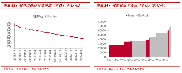 1、西澳矿山方面,当前锂辉石价格(Li2O 5%min 中国到岸)已经跌至390美元/吨,从矿山披露的现金成本来看,Altura现金成本(FOB)为369美元/吨,Mt Cattlin二季度现金成本(FOB)为412美金/吨,Pilbara和Marion现金成本(CFR)在450美元/吨左右,Bald Hill现金成本在550美元/吨左右,由此可见,除Greenbushes外,西澳矿山基本处于亏损状态;