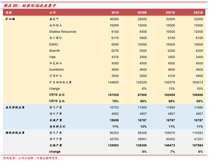 钴矿山端高度垄断。从国别来看,刚果金约占全球钴矿供给的70%;从企业层面来看,前十大矿山供应量占比达到60%+,其中嘉能可为全球最大钴供应商,占比接近20%,2019年底嘉能可关停Mutanda矿山,奠定了中期收缩的趋势。
