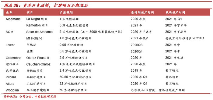 高成本矿山关停(比如Bald Hill、Wodgina项目)是2019年市场的额一个明显特征,标志着产能出清、行业格局重塑过程的开启,由于锂价的大幅下滑,2020年的一个明显特征就是低成本南美盐湖企业开始放缓资本开支,不断推迟扩建项目的投产日期: