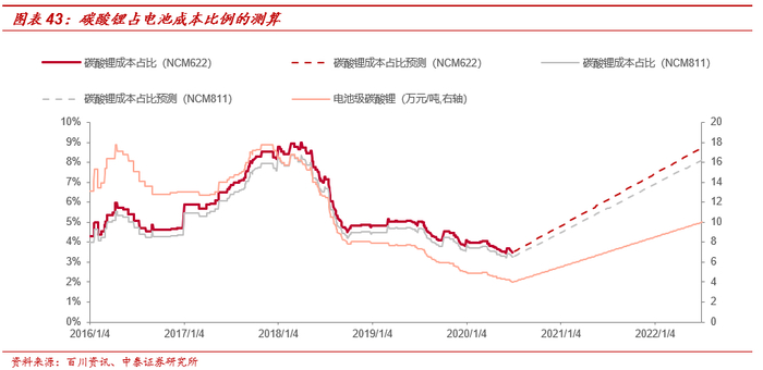 供需结构定方向,下游成本接受意愿定高度。按照2016-2017年主要的三元材料NCM622的成本占比,碳酸锂成本占比最高时占比约10%左右,这也是下游厂商可以承受的价格范围内。按照目前的电池价格进行测算,则对应的碳酸锂价格为10万元/吨LCE左右。