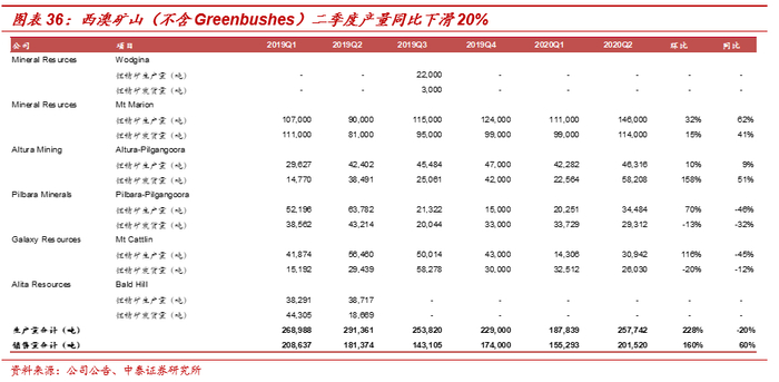 4、Altura生产维持正常,公司2020Q2锂精矿产量46,316湿吨,同比增长9%,环比增长10%,上半年共生产锂精矿88,598湿吨,同比增长23%;从销量方面看,公司2020Q2锂精矿销量58,208吨,同比增长51%,环比增长158%,因此库存水平有所下降;