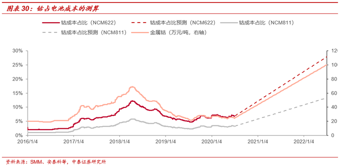 供需结构定方向,下游成本接受定高度。按照2016-2017年主要的三元材料NCM622的成本占比,钴成本占比最高时占比约15%左右,这也是下游厂商可以承受的价格范围内,若按照未来NCM811品种的成本状况,则当金属钴涨到100万元/吨时,钴约占NCM811电池成本的13%左右。