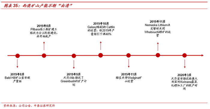 5、Bald Hill矿山于2019年8月宣布破产重组,ALB于2019年11月关停Wodgina矿山运营,2020年3月天齐宣布推迟西澳大利亚州Kwinana氢氧化锂加工厂的投产时间。