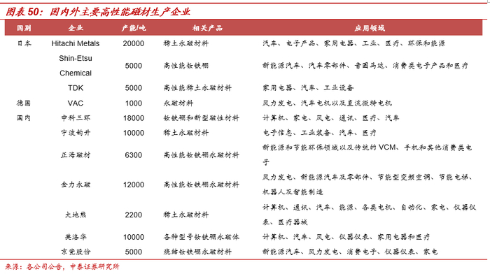 高行业壁垒决定未来行业有效供给有限,市场格局较为集中:1、具备有效供给能力的行业领先者为数不多:拥有相对中低端的风电领域的业务的公司约50家,而涉及传统汽车EPS业务的公司约10家,相对高端的新能源车电机业务的公司不超过5家。2、高壁垒导致以新能源车产品为代表的高端磁材格局更为集中:资金与认证等壁垒由于投建高端产线,需要较高的资金开支,并且需要2年左右建设投产周期,叠加下游客户认证周期较长(一般2-3年或以上),并且不会轻易更换供应商。3、考虑到上述壁垒,海外市场的竞争更为集中,主要竞争集中在 2-3家企业之间。
