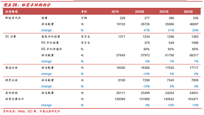 “产能周期+需求周期+库存周期”共振,钴价或将上行。假设2020-2022年全球新能源车销量分别为277/386/526万辆,NCM811渗透率分别为15%/30%/40%,动力电池领域对钴的需求量分别为2.67/3.51/4.67万吨;假设2020-2022年全球智能手机销量分别为12.34/12.96/13.60亿部,同比分别增长-10%/5%/5%,则3C消费电子对钴消耗量分别为5.80/6.18/6.63万吨。综合来看,预计2020年钴将维持紧平衡的状态,21年开始出现短缺,考虑到补库需求,供需格局将完全扭转。