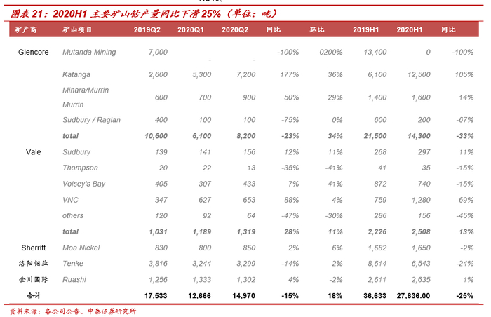1)嘉能可(Glencore)2020年上半年共生产钴14300金属吨,同比下滑33%。分矿山来看,铜钴矿方面,公司暂停位于刚果金Mutanda铜钴矿的运作是导致上半年钴产量同比大幅下降的原因,Mutanda铜钴矿的钴产量占19年上半年产量的62%;相比之下,公司提高了Katanga铜钴矿的生产,该矿20Q2钴产量同比上涨177%,达到7200吨;镍钴矿方面,位于加拿大的Sudbury / Raglan矿山20Q2产量为900吨,同比增长50%,澳大利亚的Murrin Murrin矿山20Q2产量为100吨,同比下降75%。2020年一季度,嘉能可将2020年产量指引由2.9万吨下调至2.8万吨/年,并将今年的资本支出将从最初预期的55亿美元降至40亿-45亿美元。