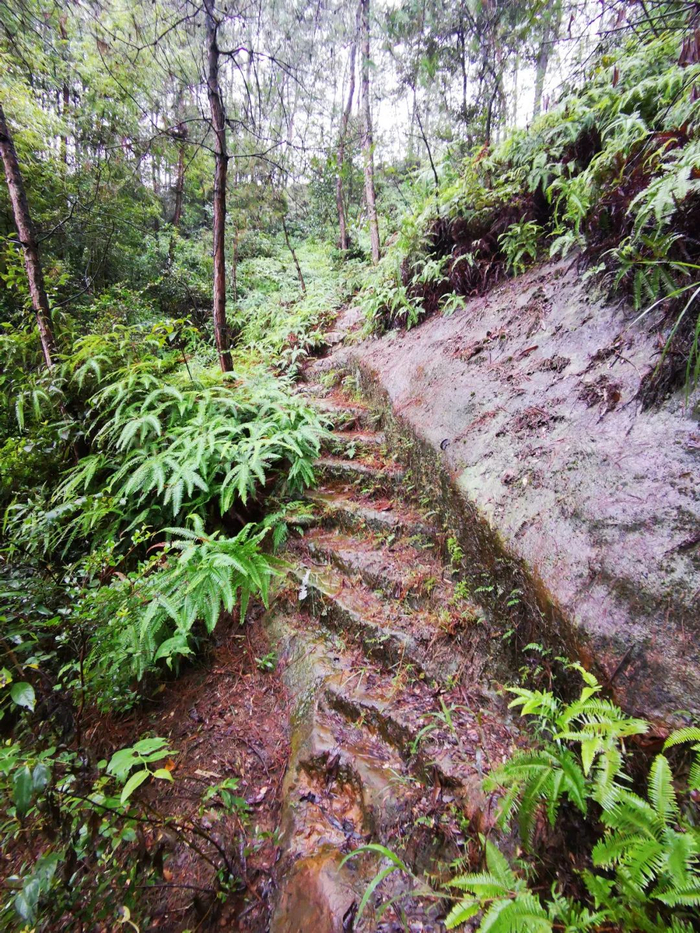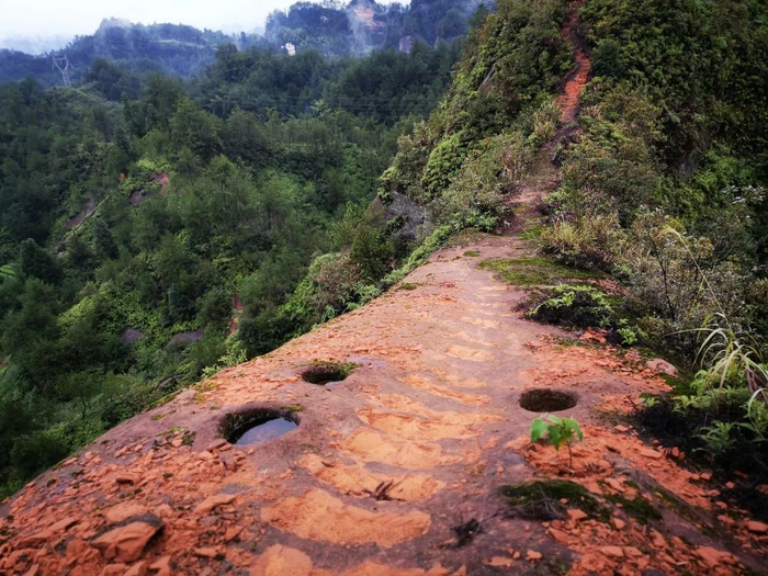 在穿洞所在山体的另一侧,可见人工在山体上开凿的梯步,两边都是悬崖。由于就我一人,且天下小雨,为安全起见,没有走上女儿寨。