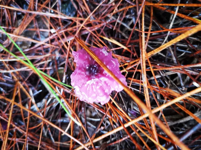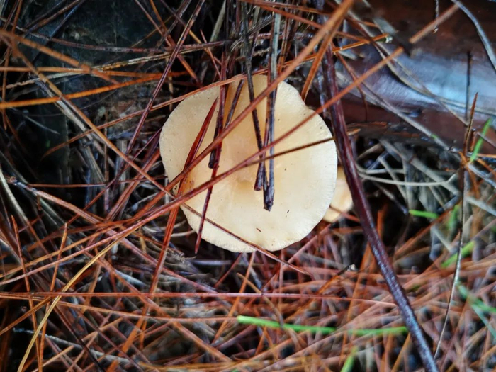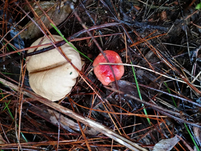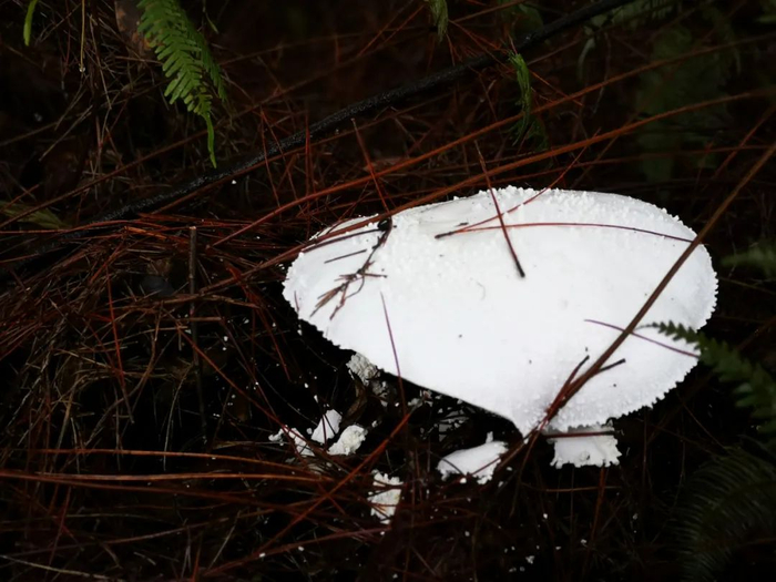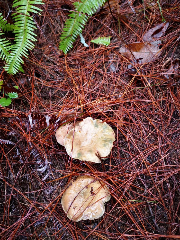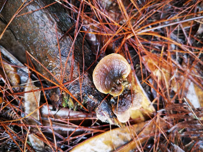 山上多枞树,很多蘑菇散落在树丛中,白的、红的、绿的,各种各样的颜色,估计很多是有毒的菌子,但也不敢采摘。