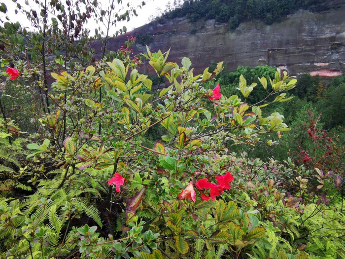 山顶上竟然还有艳山红!仔细打量附近,原来狗吠的地方又有一户崖居人家。后来听村民说姓刘,已搬到马路旁,房子那儿居住着老人。