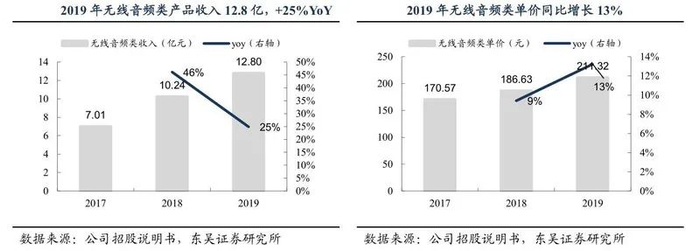 2019年,无线音频类收入12.8亿元,同比增长 25%,主要来源于无线耳机产品的爆发。2019 年无线耳机收入为7.5亿元,同比增长37%;无线音箱收入为5.27亿元,同比增长7%。该品类收入增长主要归功于单价增长,2019年单价增长13%至 211.3元,其中无线耳机部分受益于价格较高的Zolo等品牌的TWS真无线耳机持续热销,2019年无线耳机平均单价同比增长16%至 212.1元。