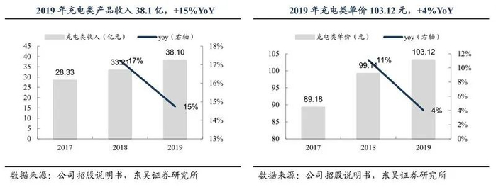 2019年充电类产品收入38.10亿元,同比增长15%,得益于2018年底面世的新型GaN(氮化镓)技术充电头提振销量。