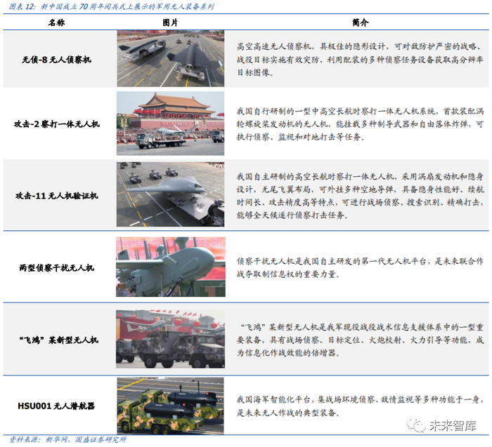 国庆阅兵仪式上大量新式无人装备的亮相,表明了我军越来越重视无人装备在未来战争 中的作用,并将进一步加大对无人装备的武器研发、作战演习的投入。未来战场上,大 量智能化无人装备的使用,将使传统的作战观念得到完全改观,作战目标将不再是歼灭 敌方有生力量,而是瘫痪敌方作战体系。目前我国多型号先进无人机相继定型落地,未 来我军或将进一步加大无人机采购和装备数量。