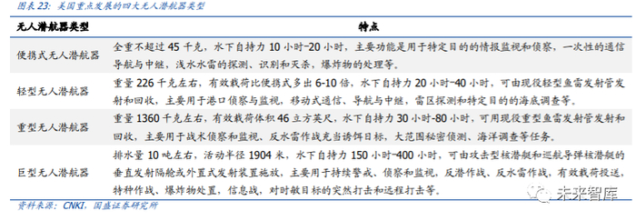美军要求无人潜航器应尽可能实现标准化,模块化和智能化。美军基于装备现状并 面向军事应用,明确给出了各级别的直径范围和可采用的发射方式(水声对抗器材、 通海抛物口、逃生舱、鱼雷发射管、垂直发射管、背驼式坞舱等),更有利于军用 UUV 成为建制装备,快速形成战斗力。按照美国《无人潜航器总体发展规划》,美国海军 重点开发和部署以下四种级别的无人潜航器。