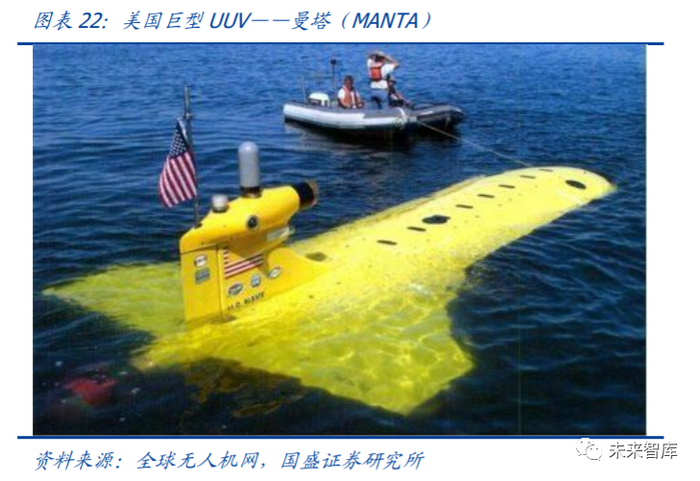 无人潜航器(UUV)是没有人驾驶、靠遥控或自动控制在水下航行的器具,主要可进行深海探测、救生、排除水雷等高危险性水下作业的智能化系统。军用领域,无 人潜航器可作为一种新概念武器中无人作战平台武器。和军用无人机样,水下潜器 也是最具代表性的无人装备。