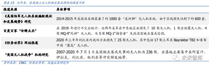 1、在军用领域,无人装备在战争中的应用场景不断拓展、消耗属性强,需求空间大。无人装备作为“消耗”品,具有“易耗”属性。由于无人装备损毁不会带来人员伤亡, 且直接损失相较于有人作战平台要小很多;此外,现代战争导弹、雷达等攻击性武器及 作战辅助装备的性能越来越先进,大大增大了装备被击毁的风险。以无人机为例,作为 “作战工具”是一种典型的消耗品,近年来,在战场上无人机被击落或损毁的报道不断。