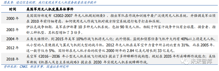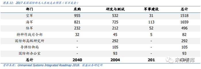 2014 年 10 月,美国智库“战略与预算中心”在其《迈向新的“抵消战略”》的报告中, 把无人作战系统技术视为未来美军五大技术支柱的核心。据美国巴德学院无人机研究中 心报告,2019 年美军希望购买 3447 架无人机,采购预算总金额 93.9 亿美元,远高于历 史每年 40-60 亿美金规模。