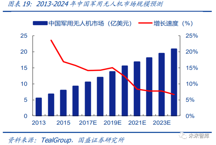 2、全球军贸,军用无人机是出口的重要方向。随着彩虹系列、翼龙、翔龙无人机的研 发成功,我国无人机技术已接近国际先进水平,部分企业如航天彩虹已实现批量出口。根据美智库 IISS 数据,2008 年至 2017 年中国出口 88 架军用无人机,相比之下美国和 以色列分别出口 351 架和 186 架,我国军用无人机出口还有提升空间。根据 TealGroup, 预计到 2024 年,全球军用无人机市场规模将达到 115 亿美元。